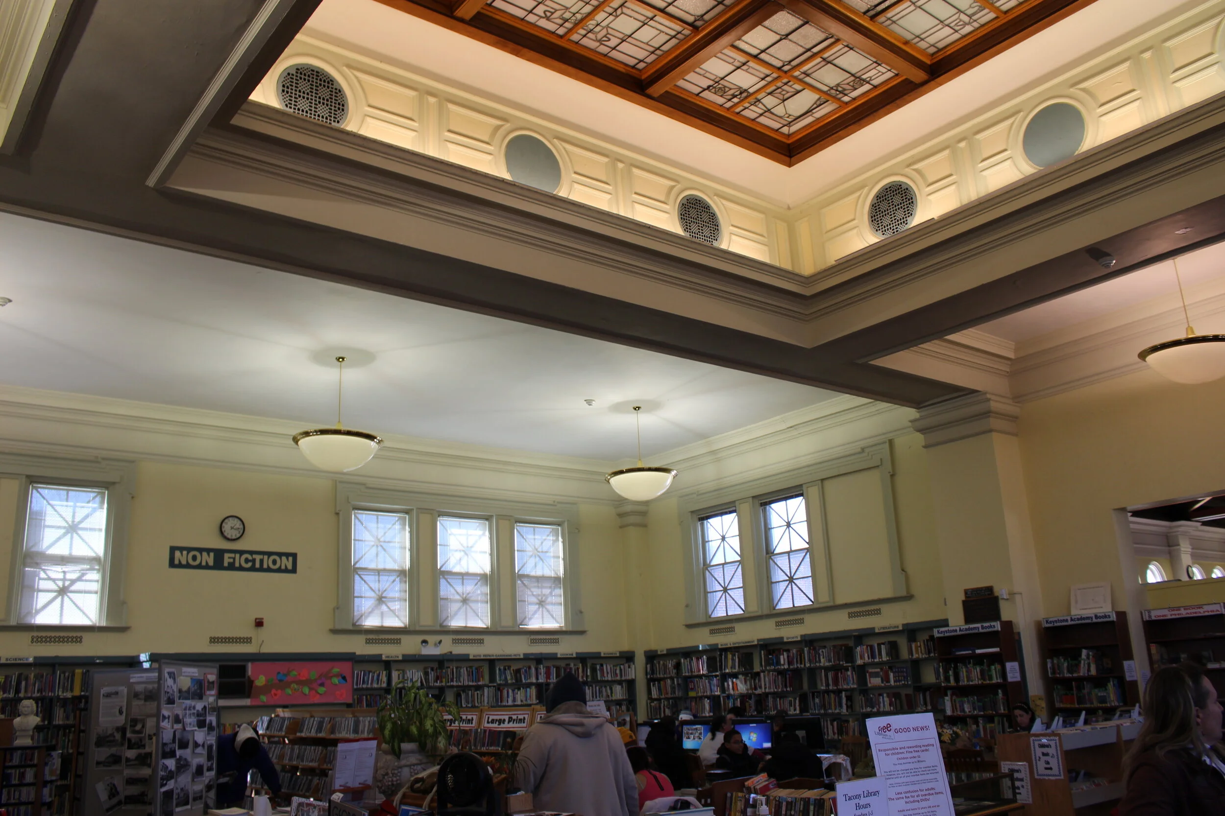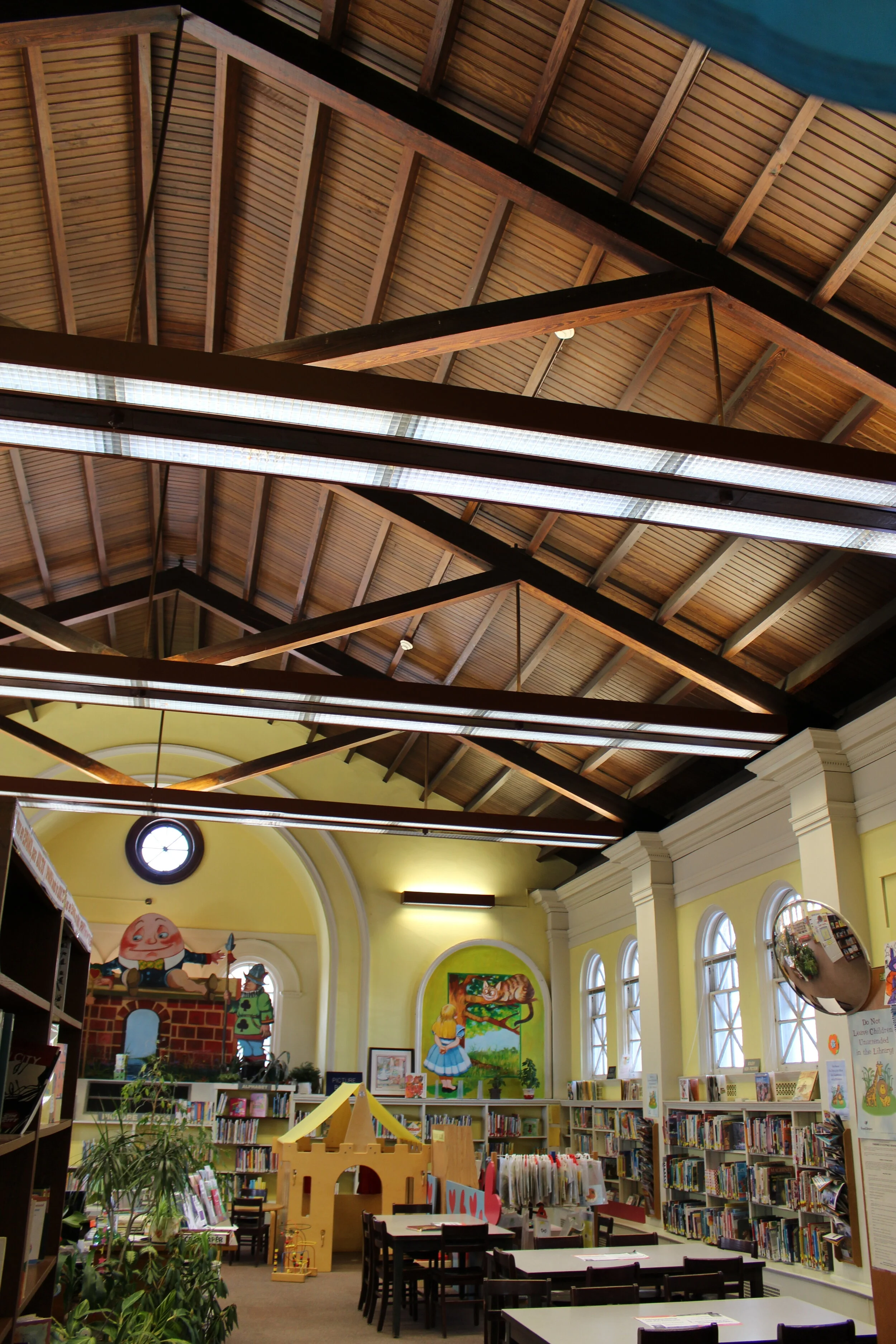 The children’s reading room was an addition to the original library. The original lighting scheme included surface mount fluorescent fixtures added above the exposed beams to highlight the ceiling with double rows of surface mount fluorescent lights added below the beams to provide general light.